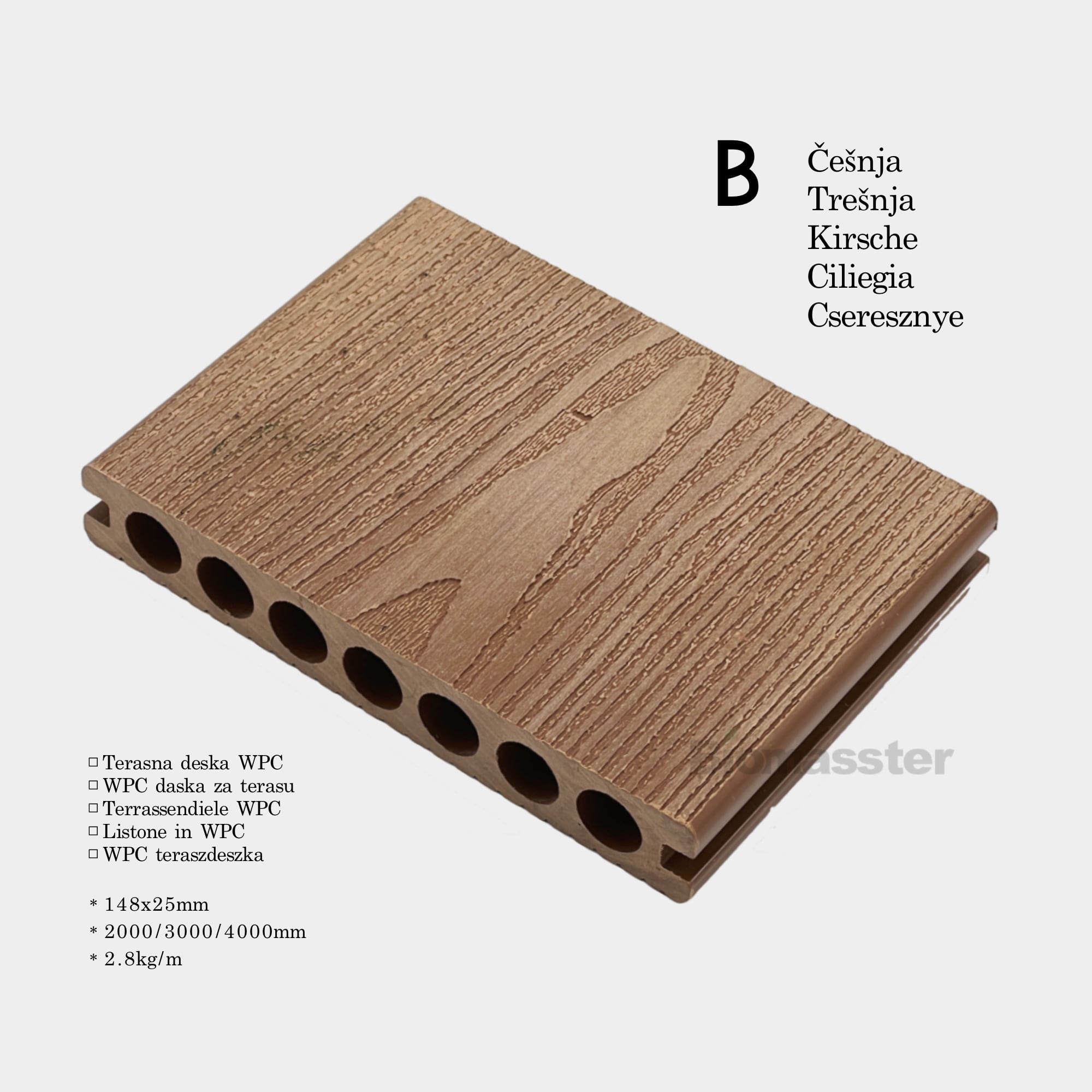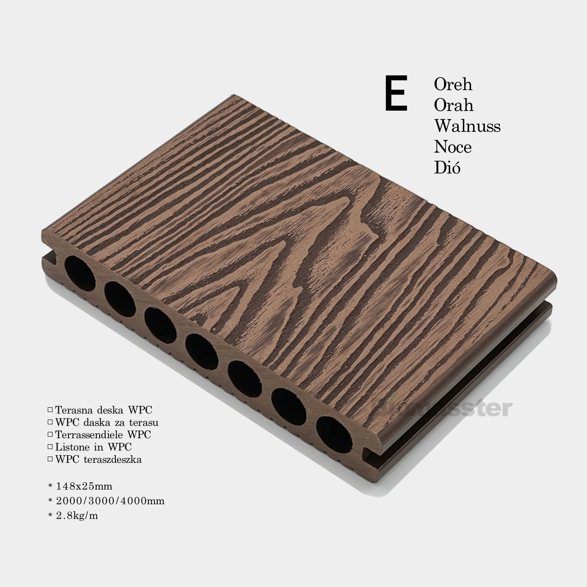 WPC terasne deske 3D imitacija lesa, druge generacije Cena brez ddv: 35,99 €/m² ali 5,04 €/m ☑️ ni na zalogi Tehnični podatki: Dimenzije: 140 x 23 x 4000 mm Teža: 2,90 kg / meter Sestava: polimer, plastična masa > 30%, lesni prah in drugi dodatki < 60% Barva: Oreh Rebrasta na eni strani in 3D imitacija lesa na drugi strani Opis Ta druga generacija WPC (lesno-plastične kompozitne) deska je nadgrajena na osnovi prve generacije, ki ima naslednje značilnosti: Uporabljenih je več plastičnih materialov kot v prvi generaciji, zaradi česar je manj vpojna. Okrogla struktura naredi desko bolj trdno. Teža je 20% večja kot pri prvi generaciji. Tehnologija 3D imitacije lesa prinaša boljši vizualni učinek. Življenjska doba se je povečala na 15 let z 10 let v prvi generaciji. Nudimo tudi dodatke za montažo desk WPC po najbolj konkurenčnih cenah v trgovini. Te WPC deske lahko uporabimo tudi za gradnjo visokih gredic. Kliknite [tukaj], če želite preveriti naš pribor za montažo. Video o izdelku Povezani dodatki Zaključni L profil za WPC deske, STANDARD, 300 cm dolgaTrdna WPC Podkonstrukcija, 4 x 2,5 x 300 cmPlastična sponka z nerjavnim vijakom za montažo WPC desk WPC deske Povezani članki Koliko veste o WPC terasnih deskah?